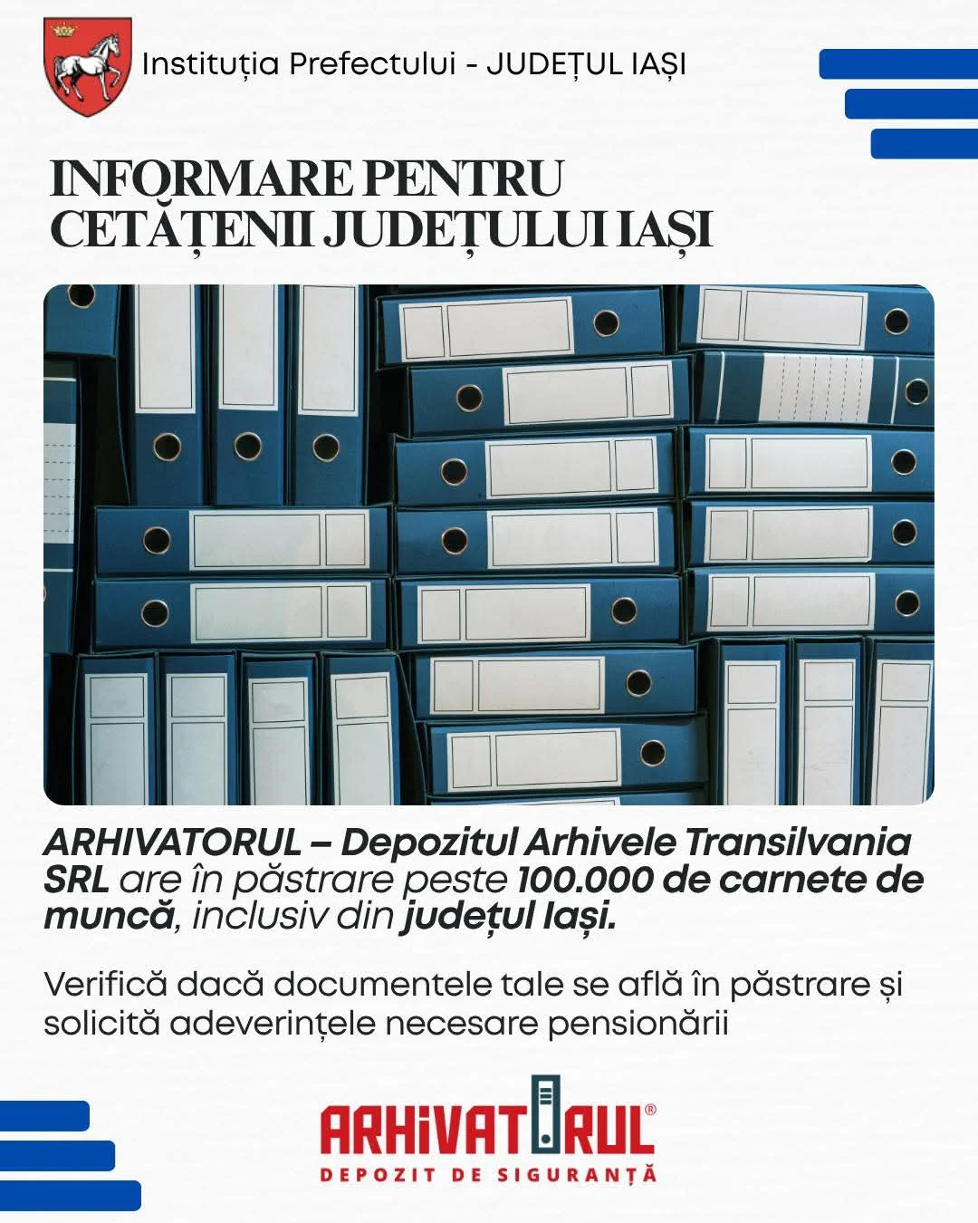 Se aduce la cunoștința publicului că ARHIVATORUL – Depozitul Arhivele Transilvania SRL are în păstrare peste 100.000 de carnete de muncă, aparținând angajaților din numeroase întreprinderi și instituții, inclusiv din județul Iași.