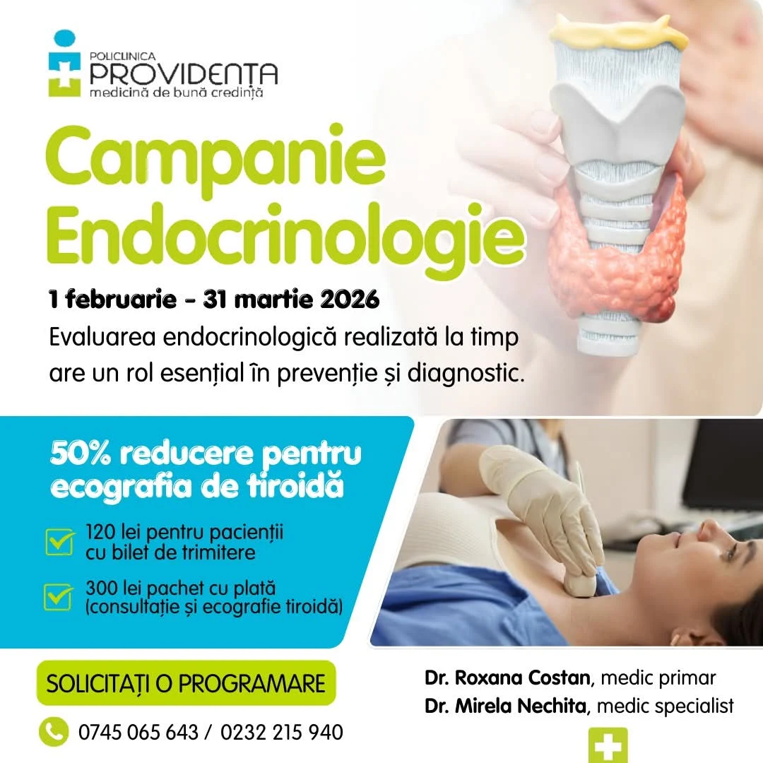 📅 În perioada 𝟏 𝐟𝐞𝐛𝐫𝐮𝐚𝐫𝐢𝐞 – 𝟑𝟏 𝐦𝐚𝐫𝐭𝐢𝐞 𝟐𝟎𝟐𝟔, Policlinica Providența derulează o campanie specială dedicată sănătății tiroidei, care include 𝟱𝟬% 𝗿𝗲𝗱𝘂𝗰𝗲𝗿𝗲 𝗽𝗲𝗻𝘁𝗿𝘂 𝗲𝗰𝗼𝗴𝗿𝗮𝗳𝗶𝗮 𝘁𝗶𝗿𝗼𝗶𝗱𝗶𝗮𝗻𝗮, în următoarele condiții: