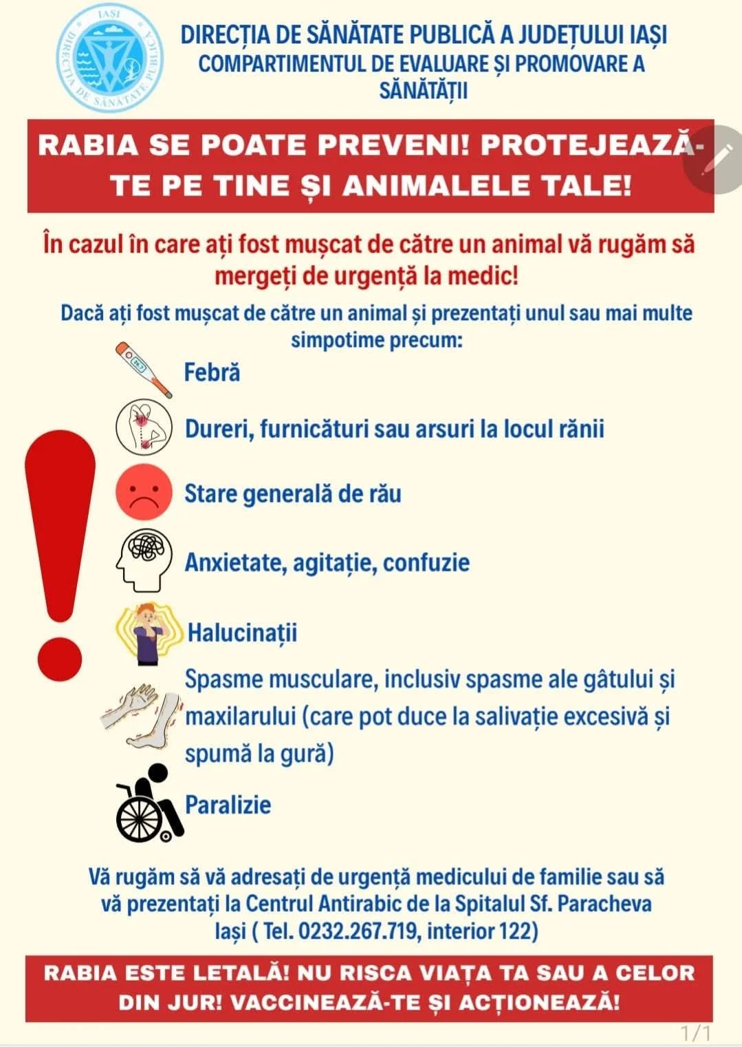 Direcția de Sănătate Publică a județului Iași transmite locuitorilor din județul Iași că RABIA este o afecțiune infecțioasă gravă transmisă de la animale la om și este declanșată de un virus care lovește sistemul nervos. Odată ce apar simptomele bolii, efectul este LETAL.