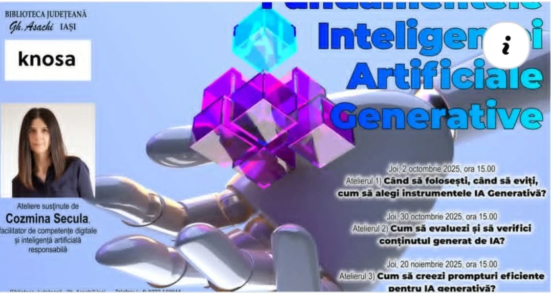 Cele trei ateliere se vor desfășura sub titlul Fundamentele Inteligenței Artificiale Generative, fiecare având o temă distinctă, vor avea loc în zilele de joi (2 și 30 octombrie și 20 noiembrie a.c.), începând cu ora 15.00, la Filiala „Ion Creangă” a bibliotecii (Casa Sindicatelor, Bd. Socola nr. 134) și vor fi susținute de Cozmina Secula, facilitator de competențe digitale și inteligență artificială responsabilă. Fiecare atelier va avea o durată de maximum 2 ore. Nu sunt necesare cunoștințe tehnice. Participanții vor lucra pe device-ul personal (telefon, tabletă, laptop).