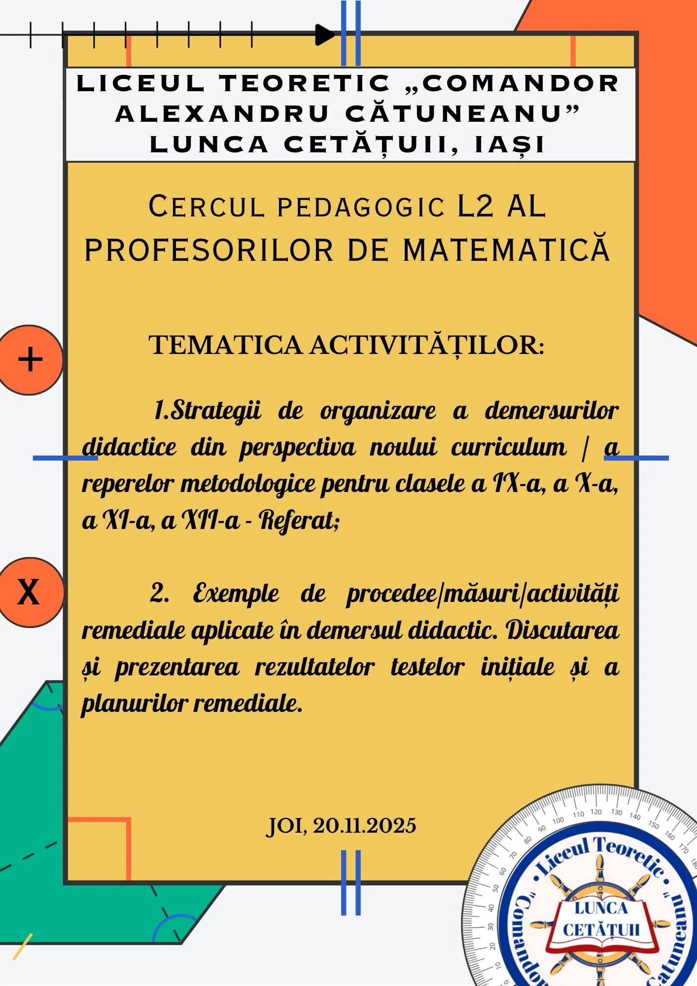 📐✨ Joi, 20 noiembrie 2025, Liceul Teoretic „Comandor Alexandru Cătuneanu” are onoarea de a fi gazda Cercului pedagogic L2 al profesorilor de matematică — un cadru dedicat dialogului profesional și perfecționării continue.