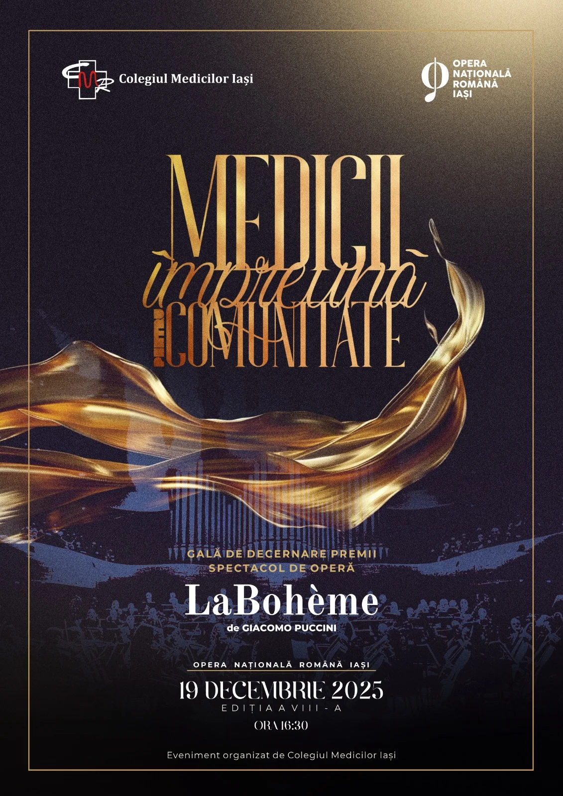 Mai întâi, de la ora 16.30, va avea loc Gala „Medicii împreună pentru comunitate”, când vor fi acordate distincții membrilor Colegiului Medicilor Iași care s-au remarcat prin merite deosebite în activitatea profesională în acest an. Ulterior, de la ora 18.30 va fi susținut spectacolul „La Boheme” de Giacomo Puccini, oferit de Opera Națională Română din Iași. La acesta pot participa doar membrii Colegiului Medicilor Iași.
