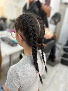 Împletitura cornrows (împletitură africană lipită de scalp) pornește din față spre spate, cu finalizare în două cozi joase.