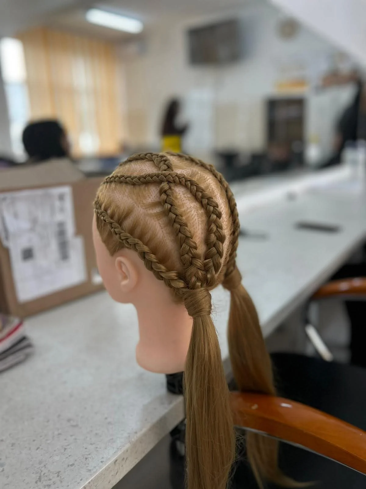 Împletitura cornrows (împletitură africană lipită de scalp) pornește din față spre spate, cu finalizare în două cozi joase.