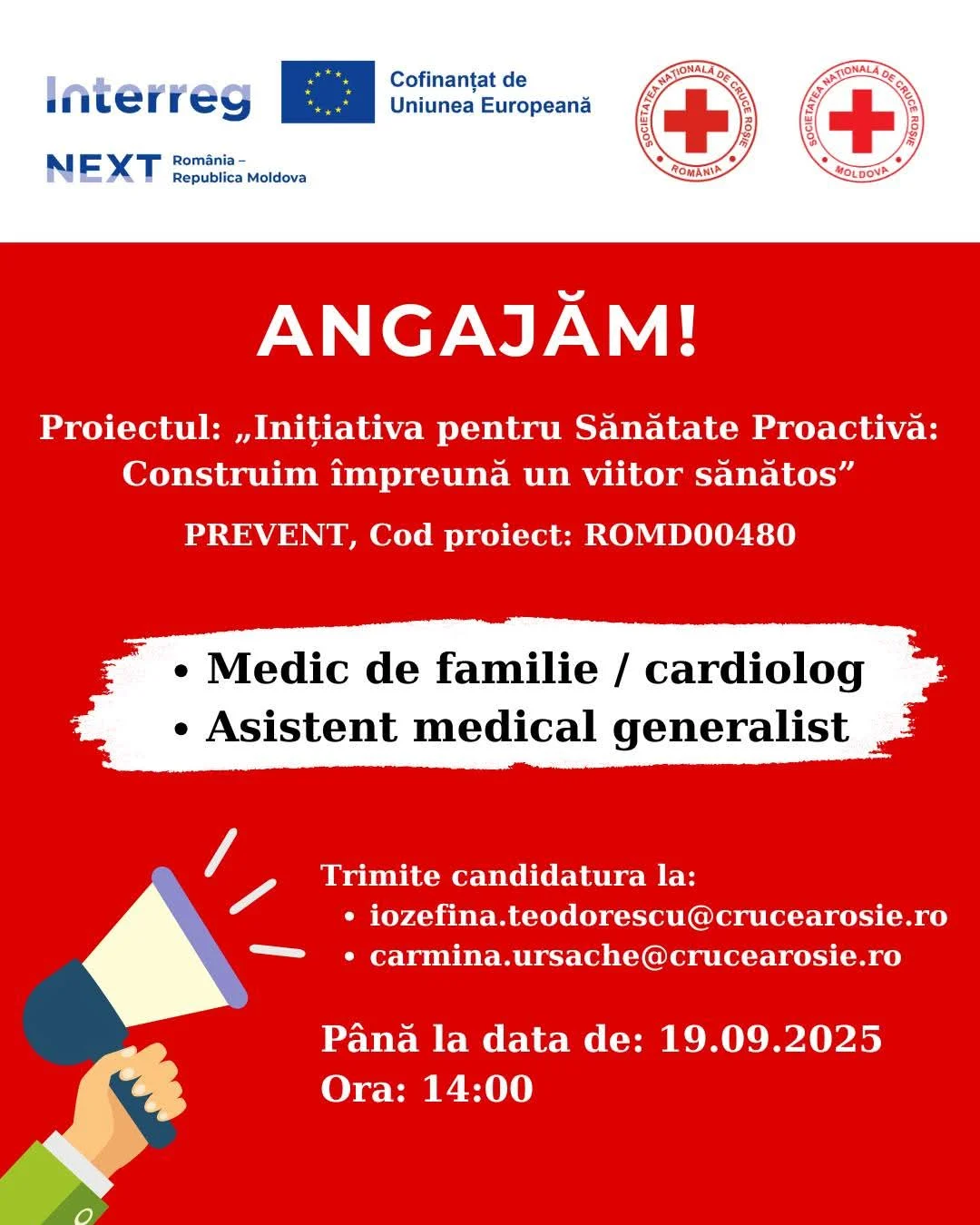 Societatea Națională de Cruce Roșie din România recrutează medic generalist/cardiolog și asistent medical generalist pentru a se alătura echipei proiectului: „Inițiativa pentru Sănătate Proactivă: Construim împreună un viitor sănătos” ce se desfășoară în parteneriat cu Societatea Națională de Cruce Roșie din Moldova în perioada 1 iunie 2025 – 31 noiembrie 2026, în cadrul programului Interreg NEXT România-Republica Moldova și are o valoare totală de 443,400.51 EUR. Cod proiect: ROMD00480.