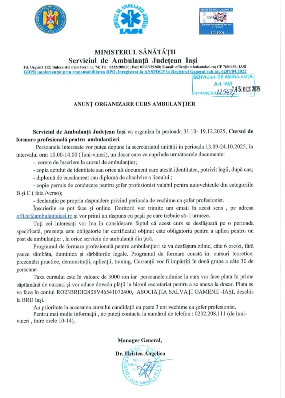 Informație oficială furnizată de Serviciul de Ambulanță Județean Iași