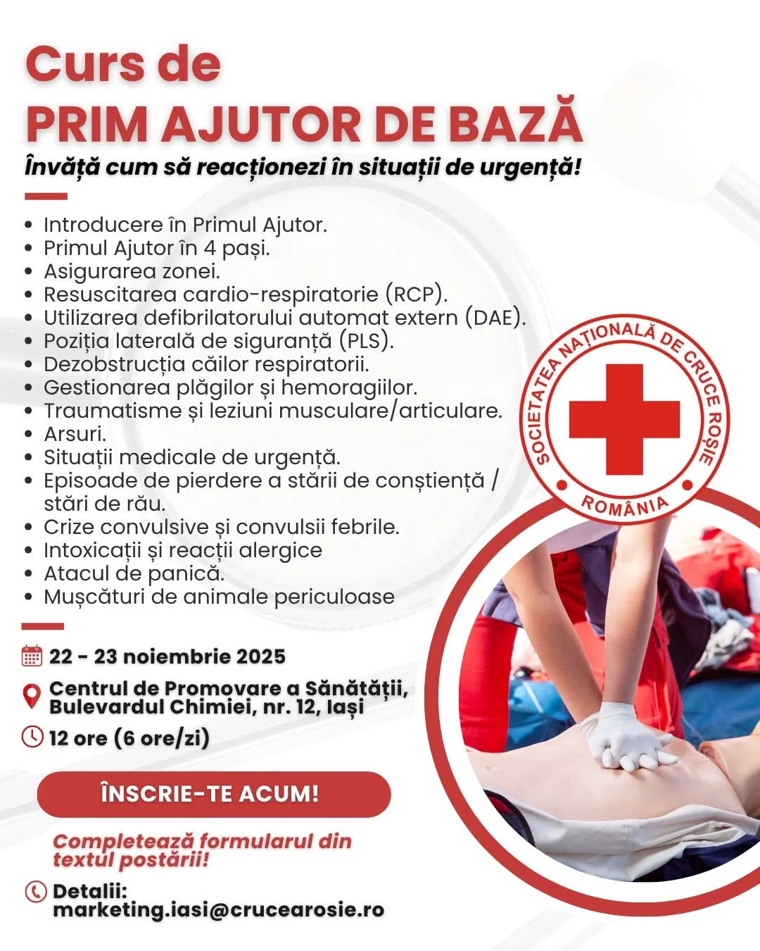 Te așteptăm sâmbătă și duminică, 𝟐𝟐 – 𝟐𝟑 𝐧𝐨𝐢𝐞𝐦𝐛𝐫𝐢𝐞 (𝟏𝟐 𝐨𝐫𝐞/𝟔 𝐨𝐫𝐞 𝐩𝐞 𝐳𝐢), între orele 𝟗:𝟎𝟎 – 𝟏𝟓:𝟎𝟎 pentru o nouă sesiune de curs de prim ajutor de bază.