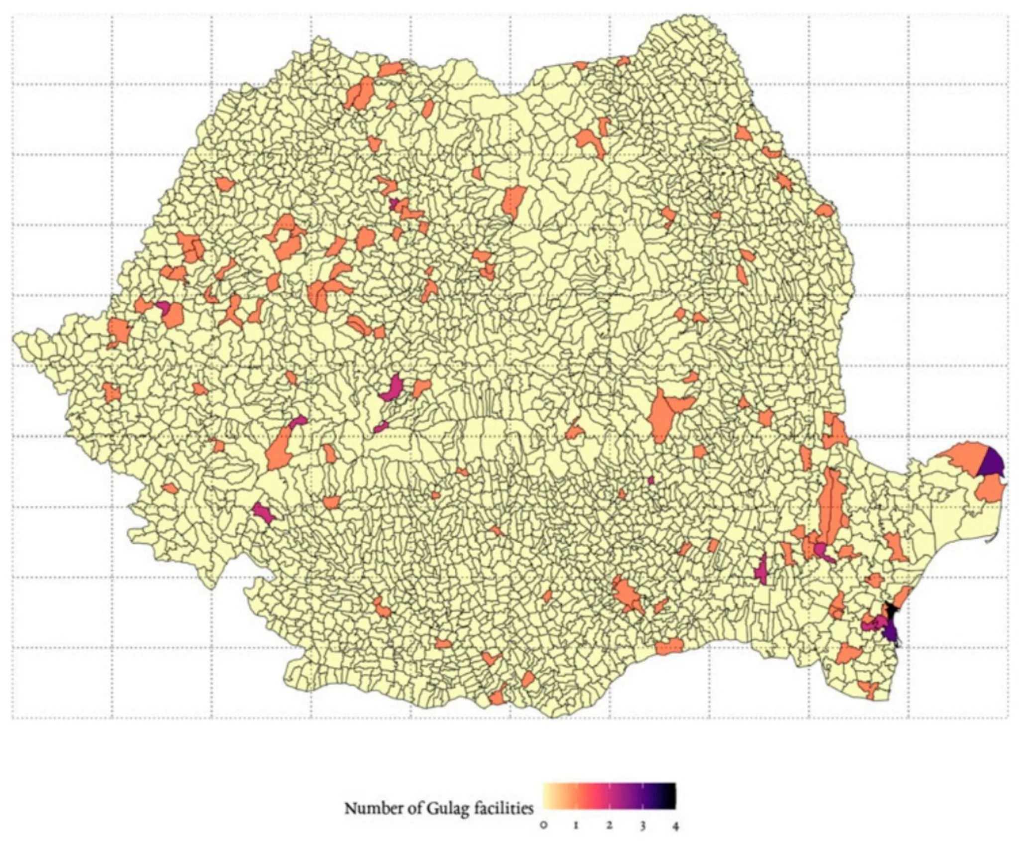 Harta ilustrează distribuția facilităților sistemului Gulag din România comunistă, evidențiind localitățile unde au existat lagăre de muncă forțată, locuri de exterminare, gropi comune și alte centre de represiune, pe baza datelor istorice analizate. Culorile variază de la galben deschis (0 facilități) la violet închis (4 facilități), arătând concentrații mai mari în anumite regiuni ale țării, precum sud, est și nord-vest. Harta este împărțită în 100 de grupuri spațiale bazate pe coordonate geografice (latitudine și longitudine), dintre care 81 conțin cel puțin o localitate, facilitând o analiză spațială a represiunii din perioada comunistă.
