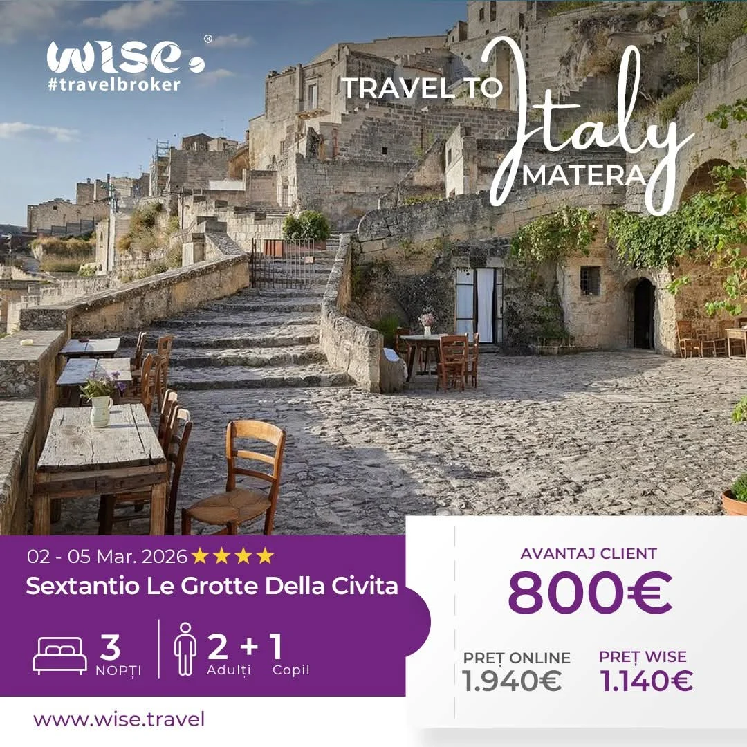 ✈️ Călătorește cu WISE.travel în inima regiunii Basilicata și trăiește o experiență de neuitat în hotelul-boutique Sextantio Le Grotte Della Civita, amenajat în peșteri istorice, cu un farmec aparte! 😍