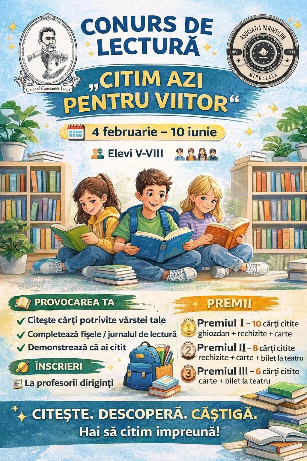De Ziua Internațională a Cititului Împreună, Școala Gimnazială „Colonel Constantin Langa” Miroslava în parteneriat cu Asociația Părinților Miroslava, lansează proiectul educațional „CITIM AZI PENTRU VIITOR”, un concurs de lectură dedicat elevilor de gimnaziu (clasele V–VIII).