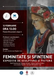 „Feminitate și sfințenie”, o expoziție de sculptură și pictură realizată în parteneriat de către elevii Seminarul Teologic Ortodox „Sf Vasile cel Mare” Iasi și elevii Liceul Teoretic „Varlaam Mitropolitul”, la Palatul Braunstein, etajul 2.