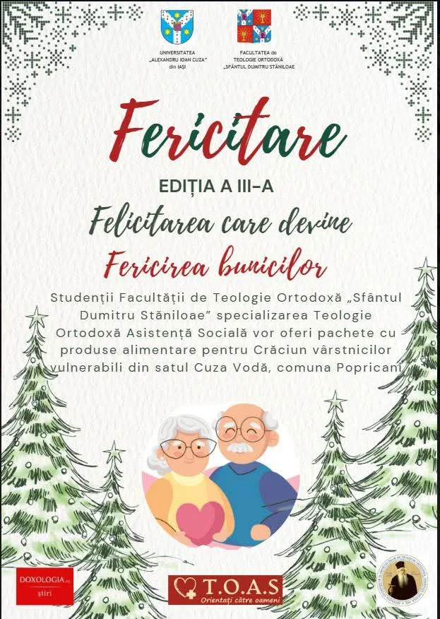 📆 În perioada premergătoare Nașterii Domnului, studenții Facultății de Teologie Ortodoxă „Sfântul Dumitru Stăniloae” specializarea Teologie Ortodoxă Asistență Socială au organizat, pentru al treilea an consecutiv, Campania FERICITARE – Proiectul prin care Felicitarea de la tineri devine Fericirea bunicilor.