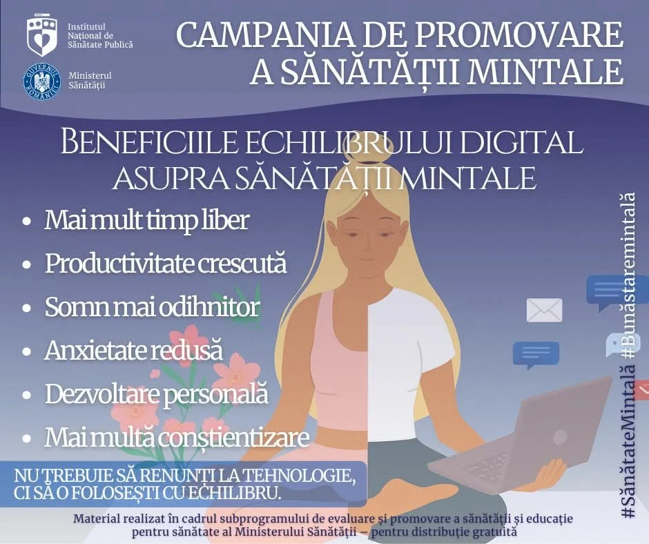 Sub sloganul ”FII CONȘTIENT! VIAȚA TRĂITĂ ONLINE ARE CONSECINȚE OFFLINE!” se desfășoară campania națională de informare, educare și conștientizare dedicată promovării sănătăţii mintale, în perioada ianuarie-februarie 2026, o inițiativă esențială pentru a aborda escaladarea provocărilor de sănătate mintală generate de utilizarea problematică a mediului digital.