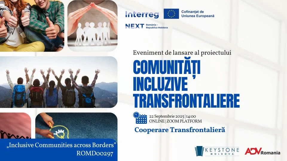 Proiectul „Comunități Incluzive Transfrontaliere” (ROMD00297) este cofinanțat de Uniunea Europeană prin Programul Interreg NEXT Romania-Republica Moldova 2021–2027 și este implementat de Keystone Moldova în parteneriat cu ADV România.
