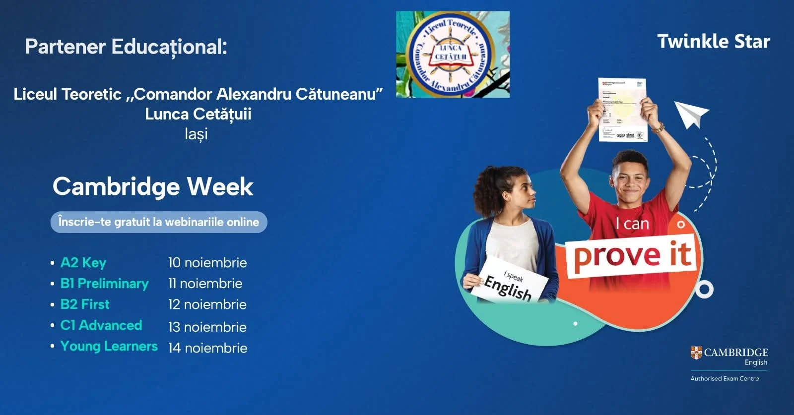 Suntem încântați să anunțăm parteneriatul nostru cu Twinkle Star – Cambridge English Educational Partner, în cadrul evenimentului CAMBRIDGE WEEK, o serie de webinarii interactive și gratuite, dedicate elevilor, părinților și profesorilor interesați de examenele Cambridge English.@Twinkle Star.