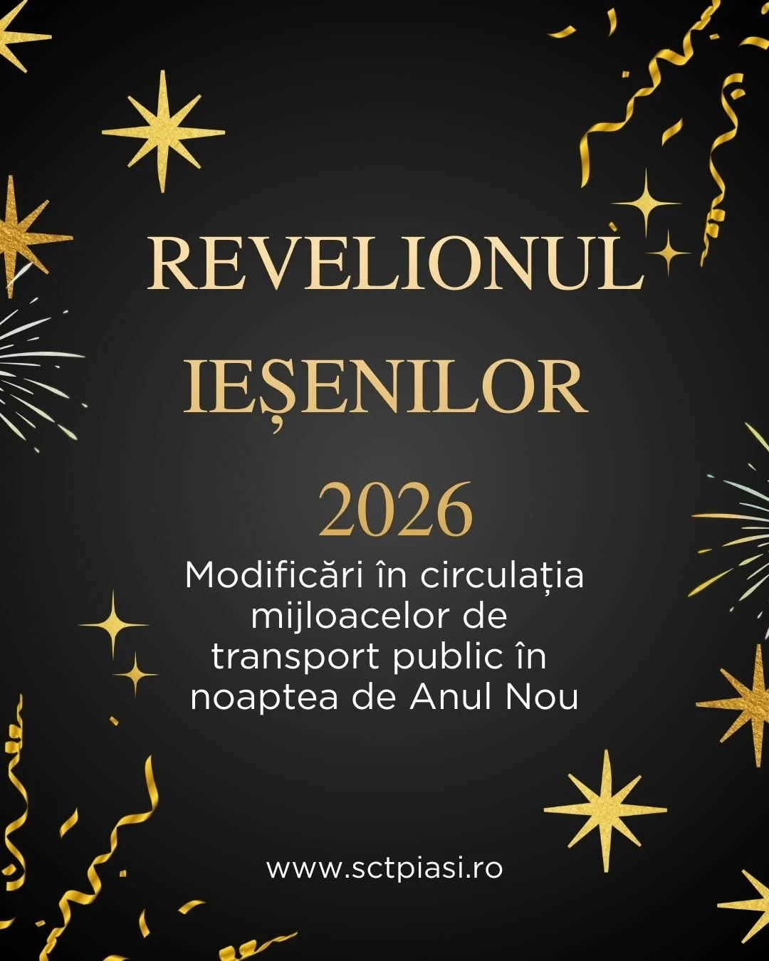 📢 🎆 În data de 31 decembrie 2025, pentru buna desfășurare a evenimentului „Revelion 2026”, vor avea loc modificări temporare în circulația mijloacelor de transport public, ca urmare a închiderii traficului rutier, începând cu ora 18:00, în Piața Palatului și pe strada A. Panu, între str. Sf. Lazăr și str. Palat.