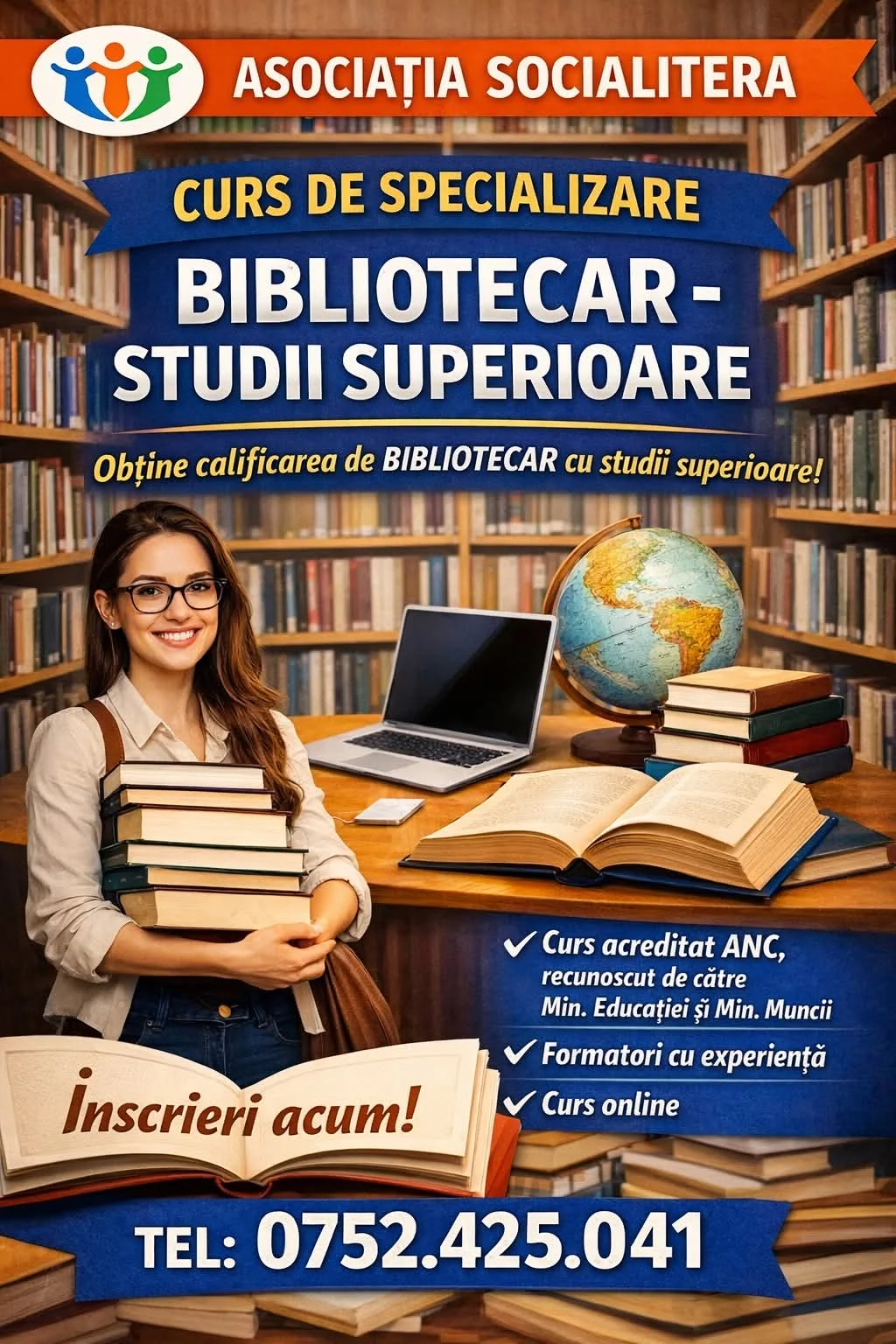 Asociația SociaLitera anunță organizarea cursului online de specializare „Bibliotecar – studii superioare”, program autorizat de Ministerul Muncii și Ministerul Educației, incepand cu luna martie 2026!