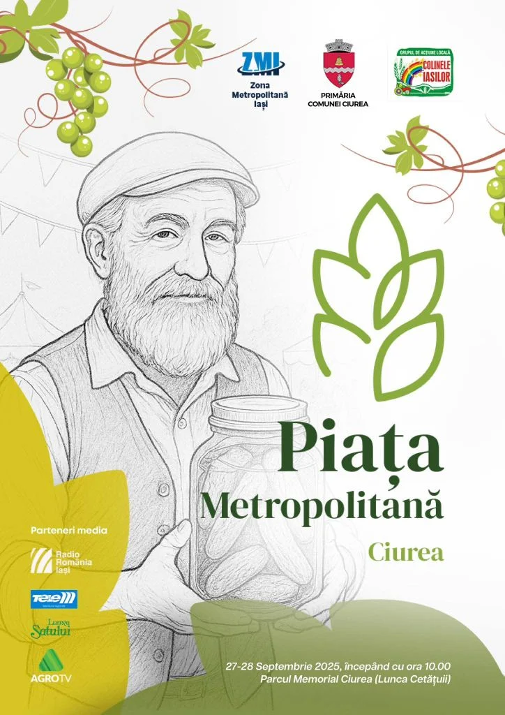 Primăria Comunei Ciurea, în parteneriat cu Zona Metropolitană Iași și GAL „Colinele Iașilor”, vă invită pe 27–28 septembrie 2025, începând cu ora 10:00, în 𝐏𝐚𝐫𝐜𝐮𝐥 𝐌𝐞𝐦𝐨𝐫𝐢𝐚𝐥 𝐂𝐢𝐮𝐫𝐞𝐚 (𝐋𝐮𝐧𝐜𝐚 𝐂𝐞𝐭𝐚𝐭𝐮𝐢𝐢), la un eveniment dedicat tradițiilor locale, producătorilor din zonă și bunătăților autentice românești.