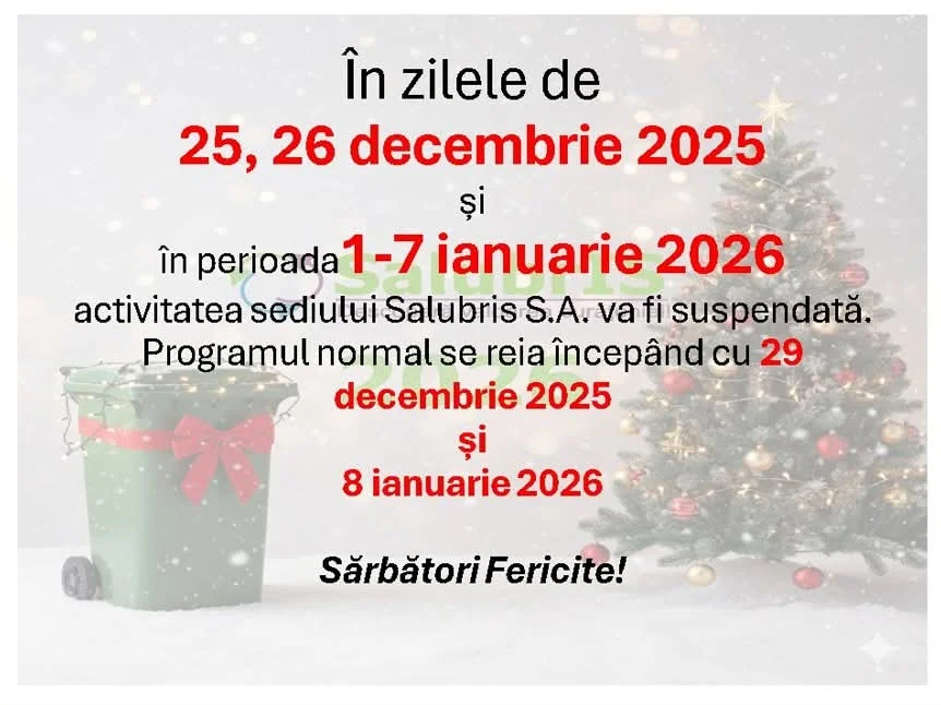 🎅Vă informăm ca societatea Salubris S.A. își va suspenda activitatea cu publicul desfașurată la sediul din șos. Națională nr.43, în perioada sărbătorilor de iarnă în zilele de 25, 26 decembrie 2025 și în perioada 1-7 ianuarie 2026.