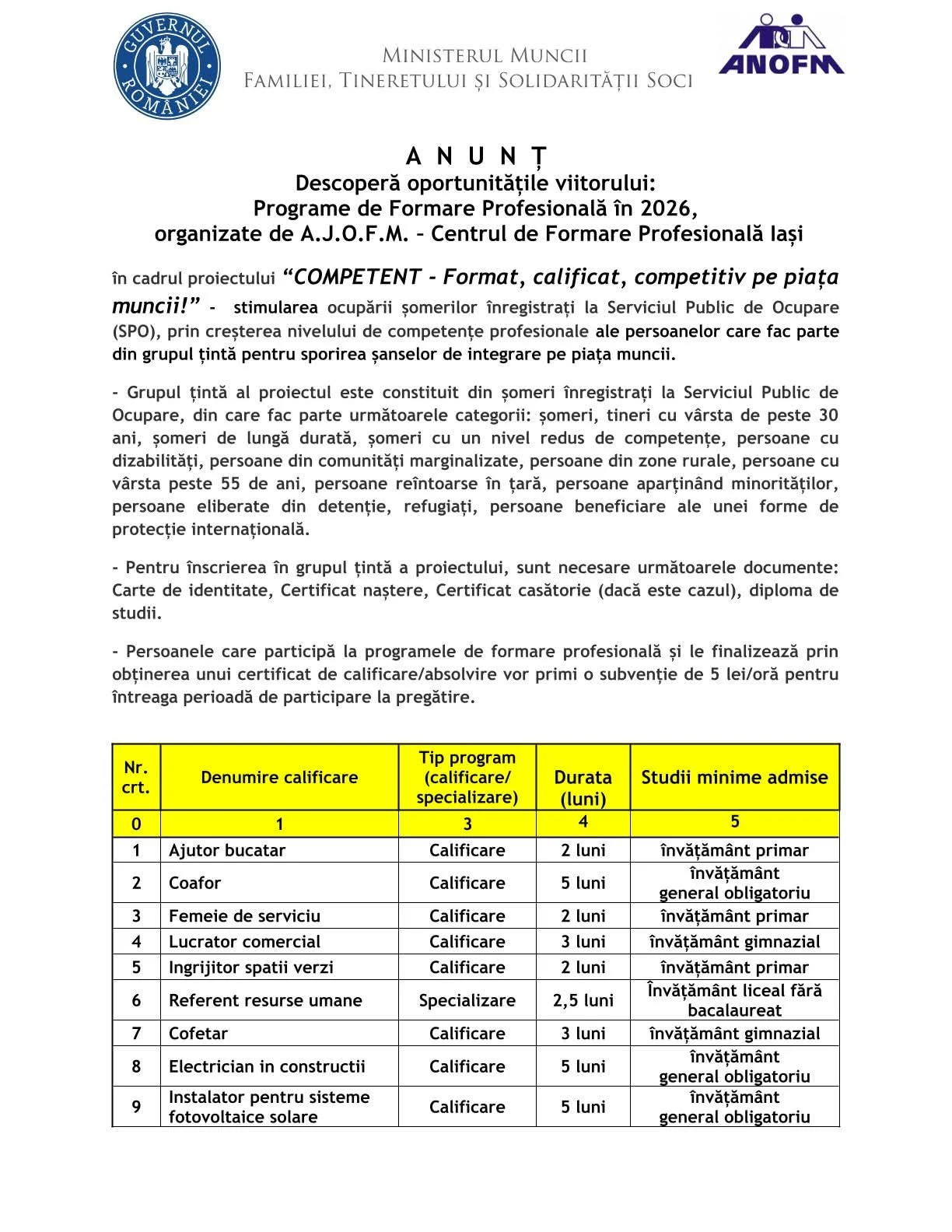 Programe de Formare Profesională 2026 organizate de A.J.O.F.M. – Centrul de Formare Profesională Iași în cadrul proiectului “COMPETENT – Format, calificat, competitiv pe piața muncii!”, prin care îți oferim șansa de a te pregăti pentru un nou început profesional!
