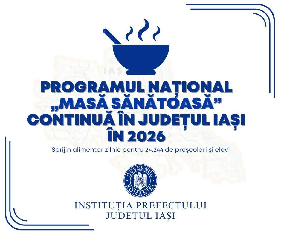 Programul Național „Masă Sănătoasă” va fi implementat și în anul 2026 la nivelul județului Iași, asigurând accesul zilnic la un suport alimentar, conform prevederilor legale, pentru 24.244 de preșcolari și elevi din unitățile de învățământ incluse în program.