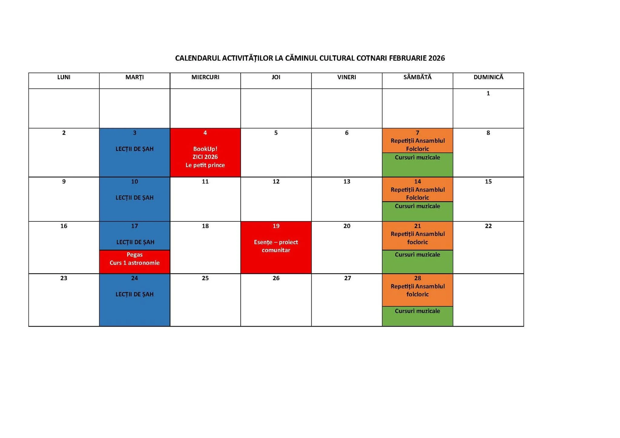 Primăria Cotnari vă invită să participați, pe parcursul lunii februarie, la activitățile educative, culturale și recreative organizate la Căminul Cultural Cotnari: