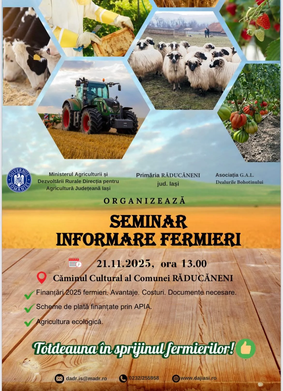 📢 Direcția pentru Agricultură Județeană Iași, împreună cu Primăria Răducăneni și Asociația G.A.L. Dealurile Bohotinului, organizează 📘 Seminarul de Informare pentru Fermieri – un eveniment dedicat sprijinirii agriculturii locale.