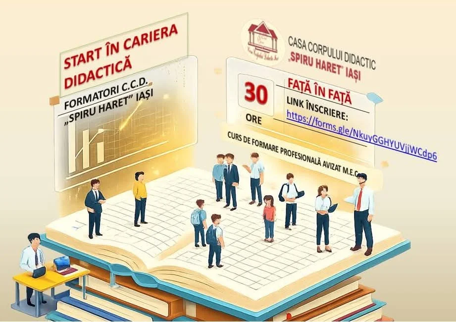 În perioada 20 mai – 20 iunie 2026, Casa Corpului Didactic „Spiru Haret” Iași organizează cursul avizat de Ministerul Educației și Cercetării, „Start în cariera didactică”, dedicat cadrelor didactice debutante care doresc să se pregătească pentru: