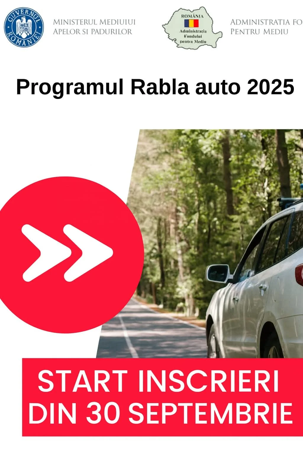 🚘 Administratia Fondului pentru Mediu anunță lansarea sesiunii de înscriere în cadrul Programului Rabla Auto 2025 pentru persoane fizice, începând cu data de 𝟑𝟎 𝐬𝐞𝐩𝐭𝐞𝐦𝐛𝐫𝐢𝐞 𝟐𝟎𝟐𝟓, 𝐨𝐫𝐚 𝟏𝟎:𝟎𝟎.