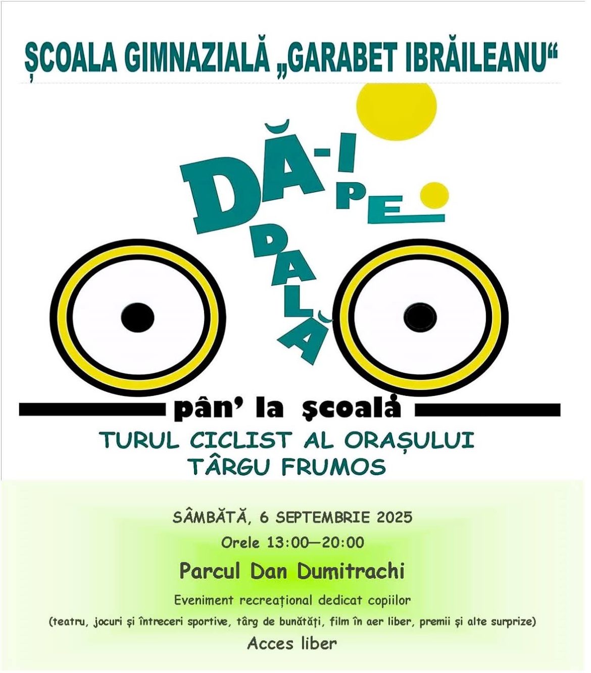Școala Gimnazială “Garabet Ibrăileanu”, în colaborare cu Primăria Orașului Târgu Frumos și cu sprijinul unor sponsori generoși, vă invită la Turul Ciclist al Orașului Târgu Frumos! Sâmbătă, 6 septembrie 2025, începând cu ora 13:00, sunteți așteptați în Parcul ,,Dan Dumitrachi”, pentru a petrece ultimul weekend al vacanței într-un mod plăcut.