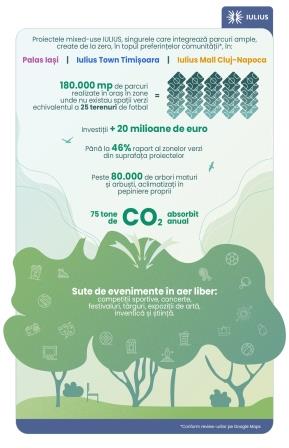 Încă de la primul proiect mixed-use, inaugurat la Iași în 2012 – Palas, compania IULIUS și-a concentrat resursele și pentru integrarea naturii în proiectele sale. Este vorba despre 18 hectare de spații verzi create de la zero sau reamenajate, în care s-au investit peste 20 de milioane de euro și care au devenit locurile preferate de petrecere a timpului liber ale comunităților din orașele Iași, Timișoara și Cluj-Napoca. Unicitatea lor este dată de faptul că sunt integrate în proiecte mixte, unde oamenii au acces la restaurante, cafenele sau diverse servicii, se pretează organizării diverselor evenimente, dar se diferențiază și prin modul de amenajare. Au fost realizate de echipe de specialişti italieni şi români, iar copacii au fost aduși cu ani înainte din Italia și aclimatizați în pepiniere temporare, astfel încât atunci când au fost inaugurate parcurile, au putut să ofere umbră încă de la început, dar și un adevărat spectacol vizual, ce poate fi descoperit și aici (https://www.youtube.com/watch?v=tciOz2J4lQY).