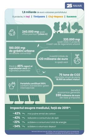 Proiectele IULIUS sunt concepte sustenabile, care integrează grădini ample, aducând natura în mijlocul orașelor, între oameni – 14 hectare de grădini urbane în iași, Timișoara și Cluj-Napoca, cu 80.000 de arbori și arbuști. Prin conceptele lor, investițiile companiei își aduc aportul nu doar la dezvoltarea urană și economică, ci și din perspectivă culturală și socială, devenind destinații ce oferă experiențe variante, pentru toate vârstele, tot timpul anului – peste 1.000 de evenimente anual, inclusiv ca parteneriate cu mediul artistic și cultural local.