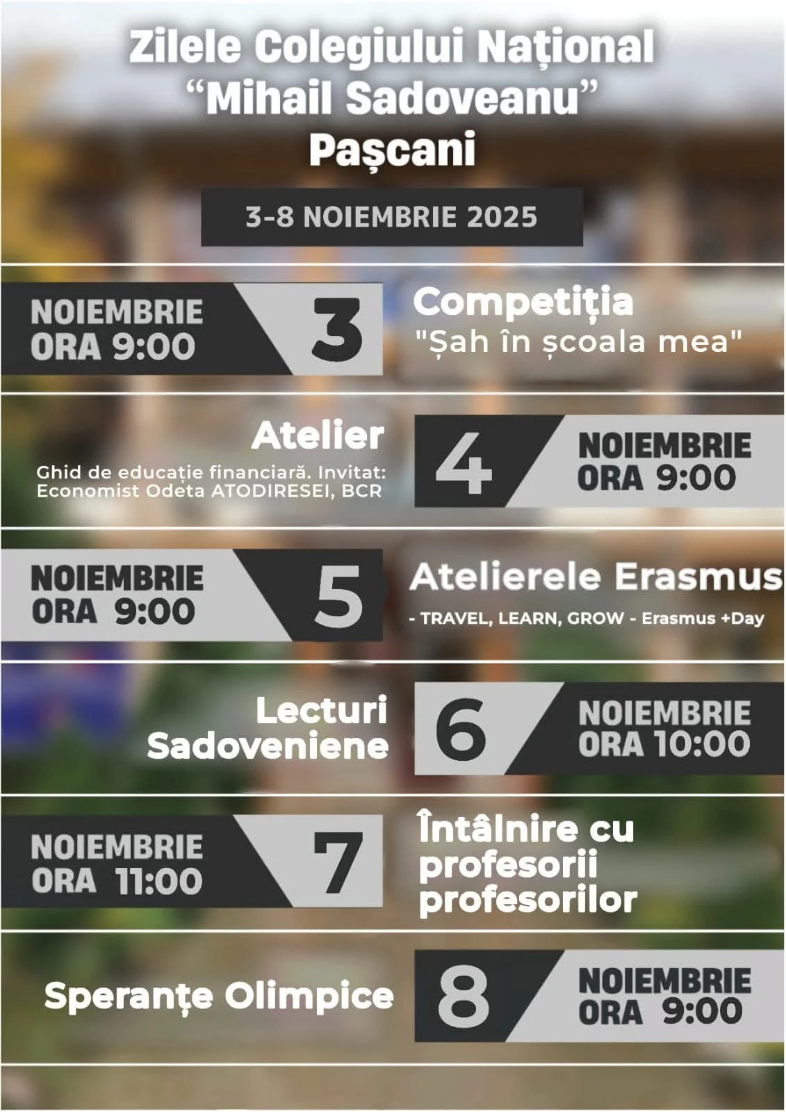 24 Vă așteptăm cu emoție și bucurie! Informație oficială publicată de Colegiul Național “Mihail Sadoveanu” Pașcani Hai pe canalul media preferat, WhatsApp sau Telegram, pentru a urmări „Pagina de Iași” – doar informații oficiale din comunitatea ieșeană. 3 milioane de euro de la UE pentru promovarea educației în domeniul mass-media Bilanț FILIT 2025: 40.000 de participanți și spectatori, 200 evenimente Filmul Minecraft – proiecție in aer liber la Pașcani Zilele Casei de Cultură a Studenților Iași, 1-5 noiembrie Ședință extraordinară de Consiliu Local cu miză enormă: 63 de milioane de euro din fonduri europene „Vacanță la Iași”, aplicație pentru Android și iOS Partajează FacebookLinkedinWhatsappTelegram Oficial Postarea anterioară Măsuri pentru creșterea ocupării în rândul romilor din județul Iași Postarea următoare 20 de proiecte europene la Iași însumând 180 milioane euro Te-ar putea interesa și 20 de proiecte europene la Iași însumând 180 milioane euro Bilanț FILIT 2025: 40.000 de participanți și spectatori, 200 evenimente Zilele Casei de Cultură a Studenților Iași, 1-5 noiembrie Ședință extraordinară de Consiliu Local cu miză enormă: 63 de... Complex Sunrise Ciric, locul unde eleganța se îmbină cu liniștea... Caravana Muzeelor mobilizează elevii din Zona Metropolitană Iași 3 milioane de euro de la UE pentru promovarea educației... Antibiotice Iași participă la CPHI Frankfurt, cel mai mare eveniment... 440 pachete școlare educaționale pentru copii din șase sate ieșene... Colegiul Economic „Virgil Madgearu” Iași aniversează 63 ani de existență Furnizarea apei potabile va fi întreruptă pe străzi din municipiul... Proiectul „Deschide-ți mintea, nu fi închis!” – Ediția a IX-a,... Întâlniri pentru viitor – o zi dedicată inspirației și orientării... Consfătuirea Anuală a Directorilor din Unităţile de Învăţământ Preuniversitar de... Cortina se ridică pentru Festivalul de teatru “Aurel Luca”, ediția... Ziua Internațională a Persoanelor Vârstnice, organizată de Primăria Iași, astăzi,... Tehnologie de ultimă generație în oftalmologie la Mediuno Cursuri gratuite pentru tineri, la Pașcani Furnizarea apei potabile va fi întreruptă în municipiul Pașcani și... Caravana „Creștem cu fiecare poveste” poposește în alte 4 biblioteci... Filmul Minecraft – proiecție in aer liber la Pașcani